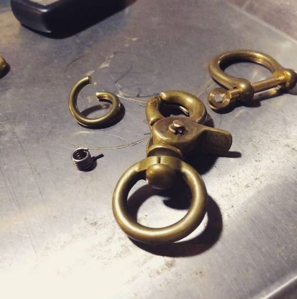 バネの折れた真鍮キーリングの修理中です。